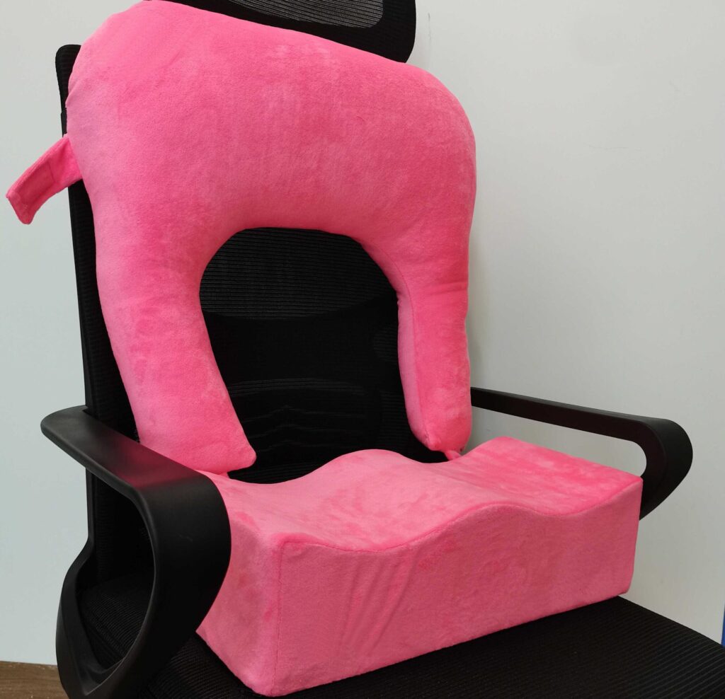 A BBL foam pillow with back support is designed to help ensure proper body positioning and support after a Brazilian Butt Lift (BBL) procedure. The pillow is contoured to fit under the thighs and lift the buttocks while also providing support to the lower back.